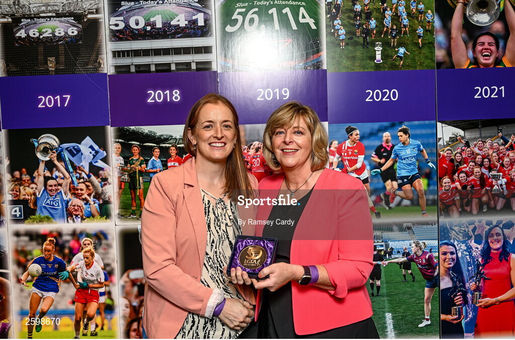 13 August 2023; 2013 Cork All-Ireland winning captain Ann Marie Walsh is presented with a medallion by former LGFA President Marie Hickey during a special luncheon before the TG4 LGFA All-Ireland Senior Championship Final at Croke Park in Dublin. Photo by Ramsey Cardy/Sportsfile