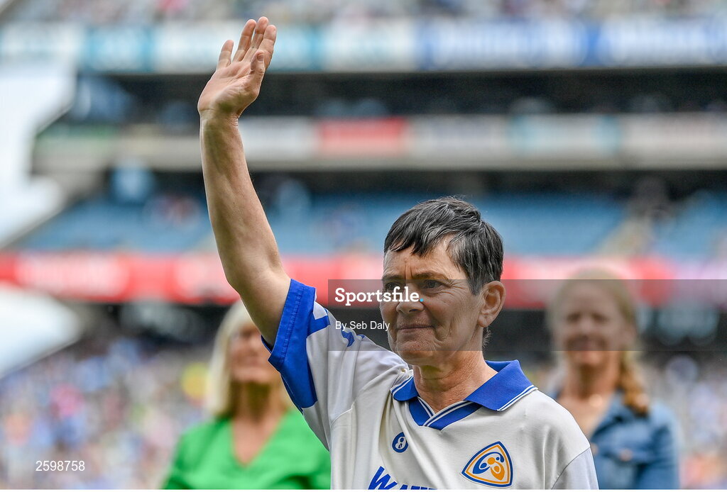13 August 2023; 1996 Monaghan All-Ireland winning captain Maggie Kearns is honoured at half-time of the TG4 LGFA All-Ireland Senior Championship Final at Croke Park in Dublin. Photo by Seb Daly/Sportsfile