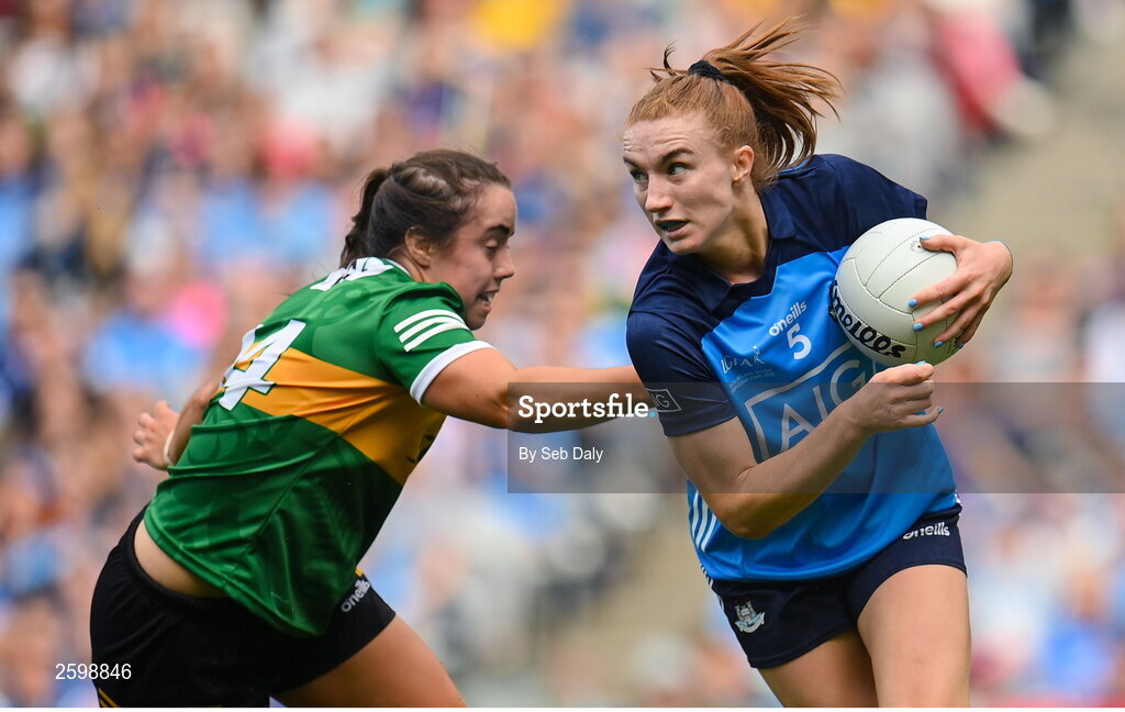 13 August 2023; Lauren Magee of Dublin in action against Danielle O'Leary of Kerry during the 2023 TG4 LGFA All-Ireland Senior Championship Final match between Dublin and Kerry at Croke Park in Dublin. Photo by Seb Daly/Sportsfile