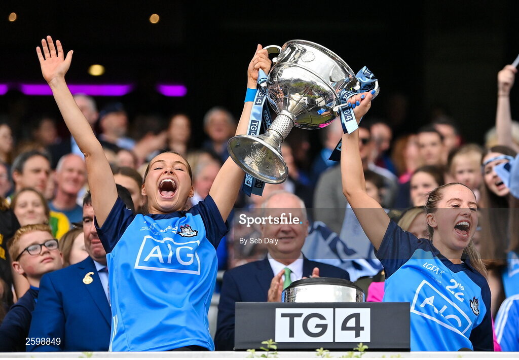 13 August 2023; Dublin players Faye O'Connell Bell, left, and Orla Martin lift the Brendan Martin Cup after the 2023 TG4 LGFA All-Ireland Senior Championship Final match between Dublin and Kerry at Croke Park in Dublin. Photo by Seb Daly/Sportsfile