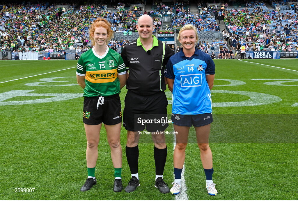 13 August 2023; Referee Shane Curley with team captains Louise Ní Mhuircheartaigh of Kerry and Carla Rowe of Dublin before the 2023 TG4 LGFA All-Ireland Senior Championship Final match between Dublin and Kerry at Croke Park in Dublin. Photo by Piaras Ó Mídheach/Sportsfile