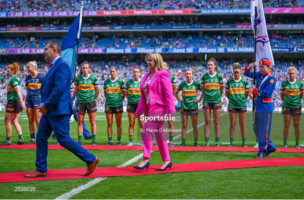 13 August 2023; Uachtarán Cumann Peil Gael na mBan Mícheál Naughton and LGFA chief executive officer Helen O'Rourke before the 2023 TG4 LGFA All-Ireland Senior Championship Final match between Dublin and Kerry at Croke Park in Dublin. Photo by Piaras Ó Mídheach/Sportsfile