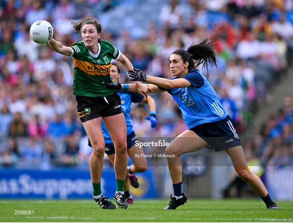 13 August 2023; Lorraine Scanlon of Kerry in action against Eilish O'Dowd of Dublin during the 2023 TG4 LGFA All-Ireland Senior Championship Final match between Dublin and Kerry at Croke Park in Dublin. Photo by Piaras Ó Mídheach/Sportsfile
