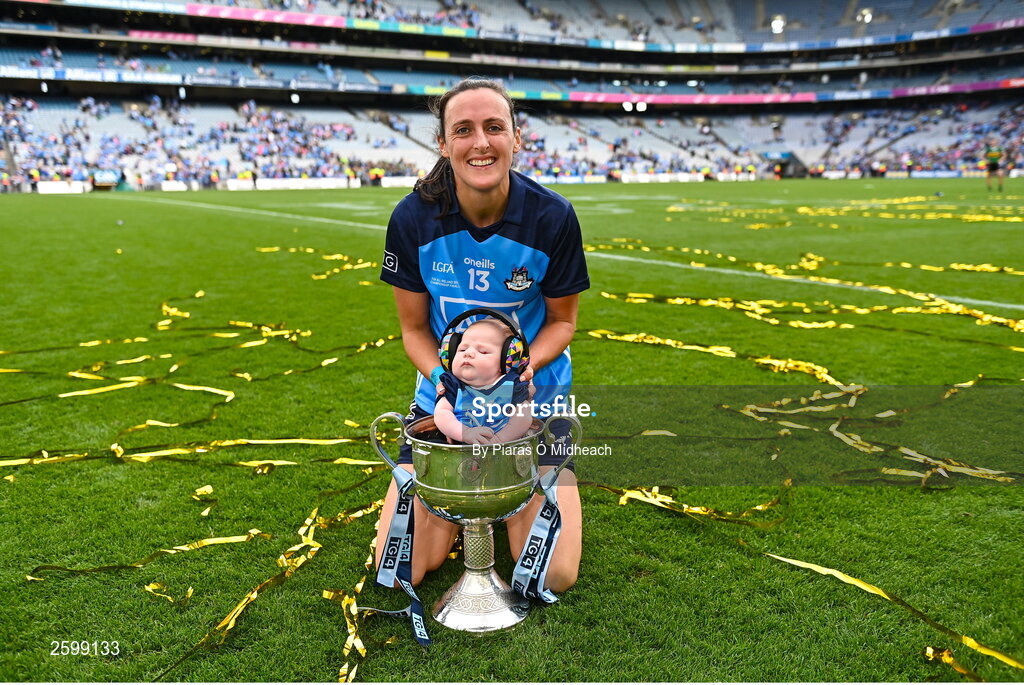 13 August 2023; Player of the match Hannah Tyrrell of Dublin celebrates with her daugher Aoife, age 7 weeks, and the Brendan Martin Cup after victory in the 2023 TG4 LGFA All-Ireland Senior Championship Final match between Dublin and Kerry at Croke Park in Dublin. Photo by Piaras Ó Mídheach/Sportsfile