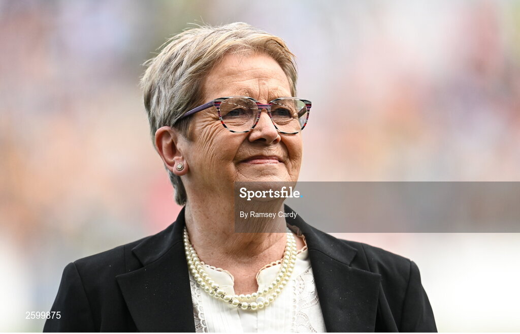 13 August 2023; 1974 Tipperary All-Ireland winning captain Kitty Savage is honoured at half-time of the TG4 LGFA All-Ireland Senior Championship Final at Croke Park in Dublin. Photo by Ramsey Cardy/Sportsfile
