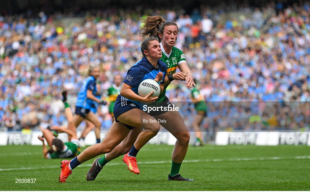 13 August 2023; Kate Sullivan of Dublin in action against Kayleigh Cronin of Kerry during the 2023 TG4 LGFA All-Ireland Senior Championship Final match between Dublin and Kerry at Croke Park in Dublin. Photo by Seb Daly/Sportsfile