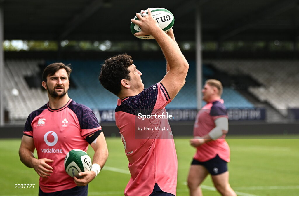 22 August 2023; Tom Stewart, centre, and Diarmuid Barron during an Ireland rugby squad training session at Parc des Sports Jean Dauger in Bayonne, France. Photo by Harry Murphy/Sportsfile