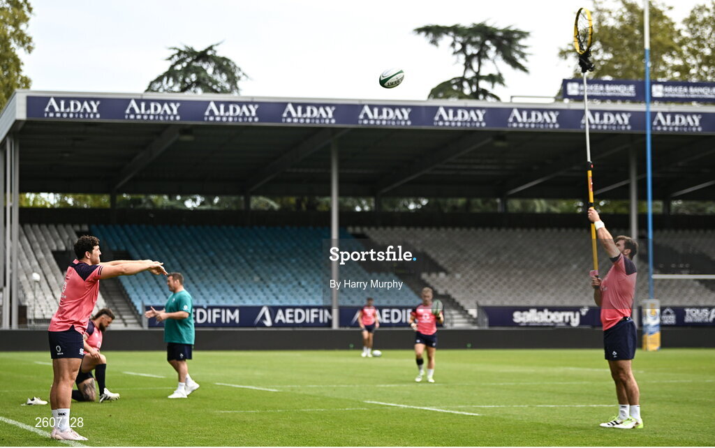 22 August 2023; Tom Stewart throws a lineout to Diarmuid Barron during an Ireland rugby squad training session at Parc des Sports Jean Dauger in Bayonne, France. Photo by Harry Murphy/Sportsfile