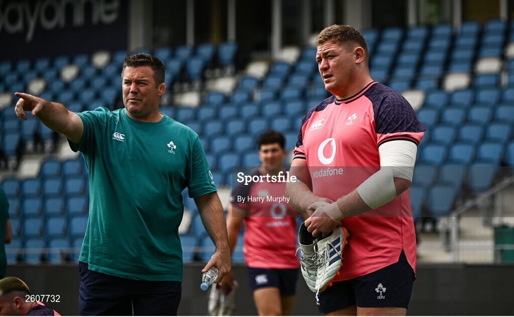 22 August 2023; Tadhg Furlong and national scrum coach John Fogarty during an Ireland rugby squad training session at Parc des Sports Jean Dauger in Bayonne, France. Photo by Harry Murphy/Sportsfile