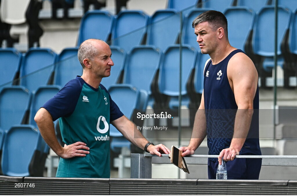 22 August 2023; Jonathan Sexton with head of physiotherapy Phil Glasgow during an Ireland rugby squad training session at Parc des Sports Jean Dauger in Bayonne, France. Photo by Harry Murphy/Sportsfile