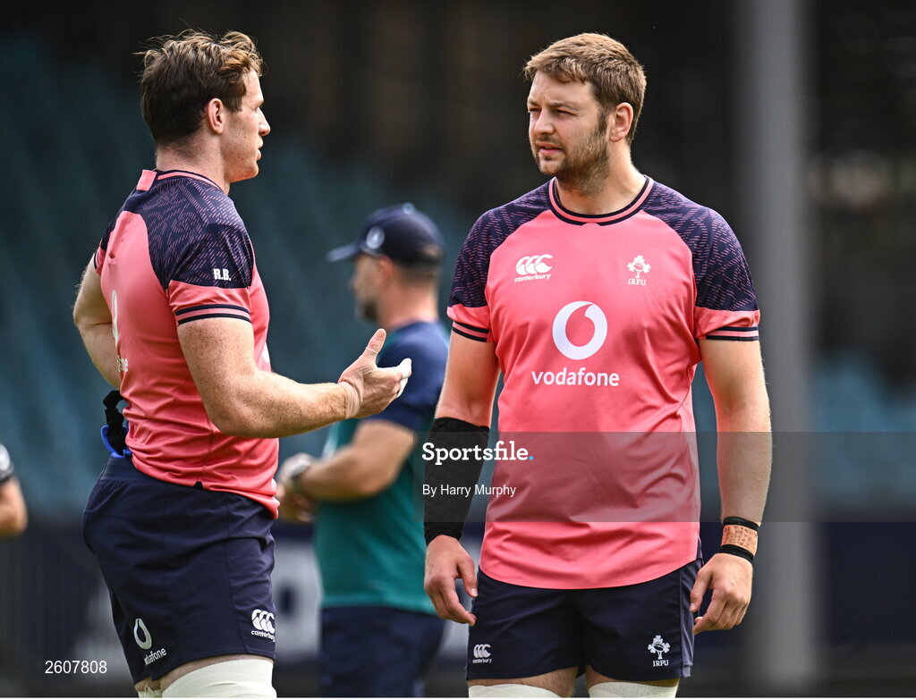 22 August 2023; Ryan Baird, left, and Iain Henderson during an Ireland rugby squad training session at Parc des Sports Jean Dauger in Bayonne, France. Photo by Harry Murphy/Sportsfile