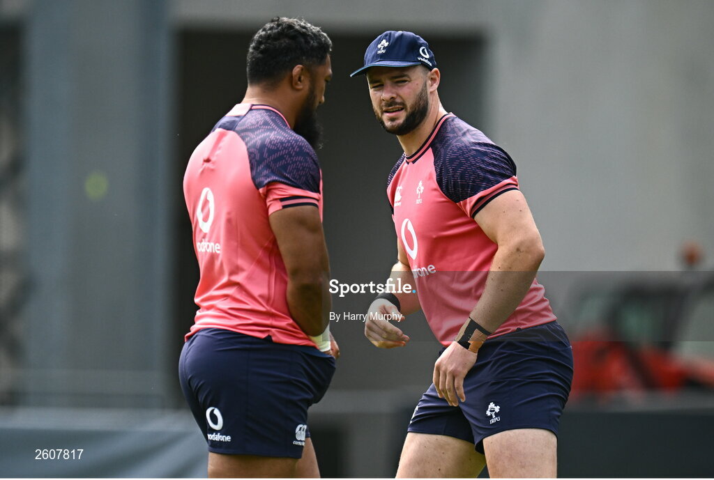 22 August 2023; Robbie Henshaw and Bundee Aki during an Ireland rugby squad training session at Parc des Sports Jean Dauger in Bayonne, France. Photo by Harry Murphy/Sportsfile