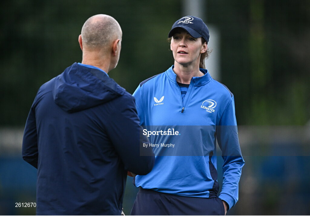 30 August 2023; Contact and breakdown coach Maz Reilly speaks with lineout coach John Fairley during a Leinster rugby women's squad training session at Energia Park in Dublin. Photo by Harry Murphy/Sportsfile