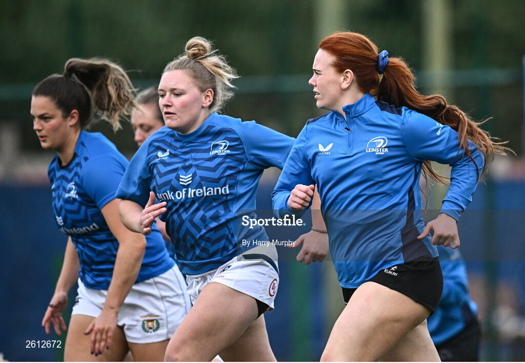 30 August 2023; Caoimhe Molloy, right, during a Leinster rugby women's squad training session at Energia Park in Dublin. Photo by Harry Murphy/Sportsfile
