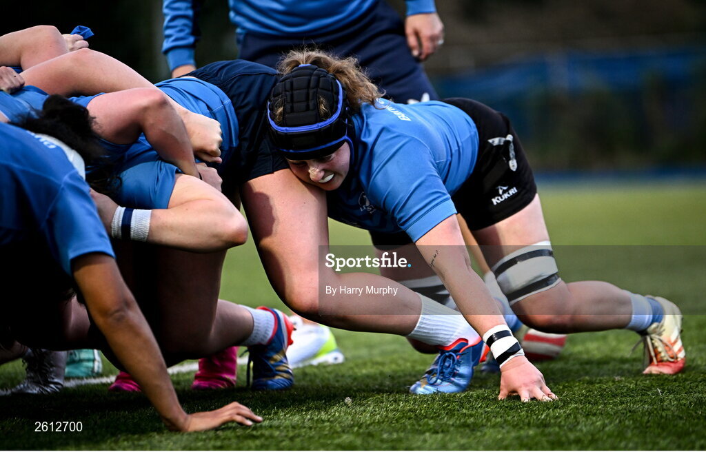 30 August 2023; Molly Boyne scrums during a Leinster rugby women's squad training session at Energia Park in Dublin. Photo by Harry Murphy/Sportsfile