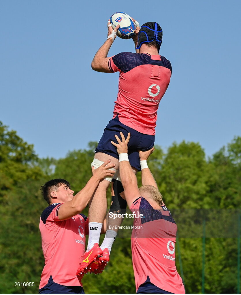 5 September 2023; Dan Sheehan, left, with Ryan Baird and Jeremy Loughman during an Ireland rugby squad training session at Complexe de la Chambrerie in Tours, France. Photo by Brendan Moran/Sportsfile