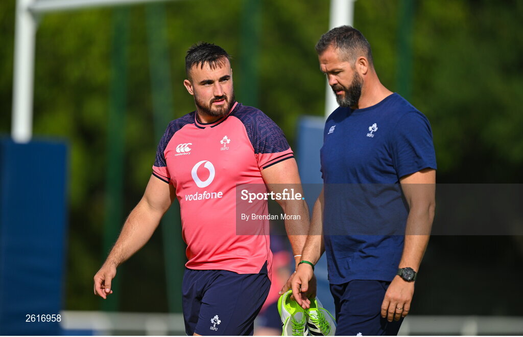 5 September 2023; Rónan Kelleher, left, with head coach Andy Farrell during an Ireland rugby squad training session at Complexe de la Chambrerie in Tours, France. Photo by Brendan Moran/Sportsfile