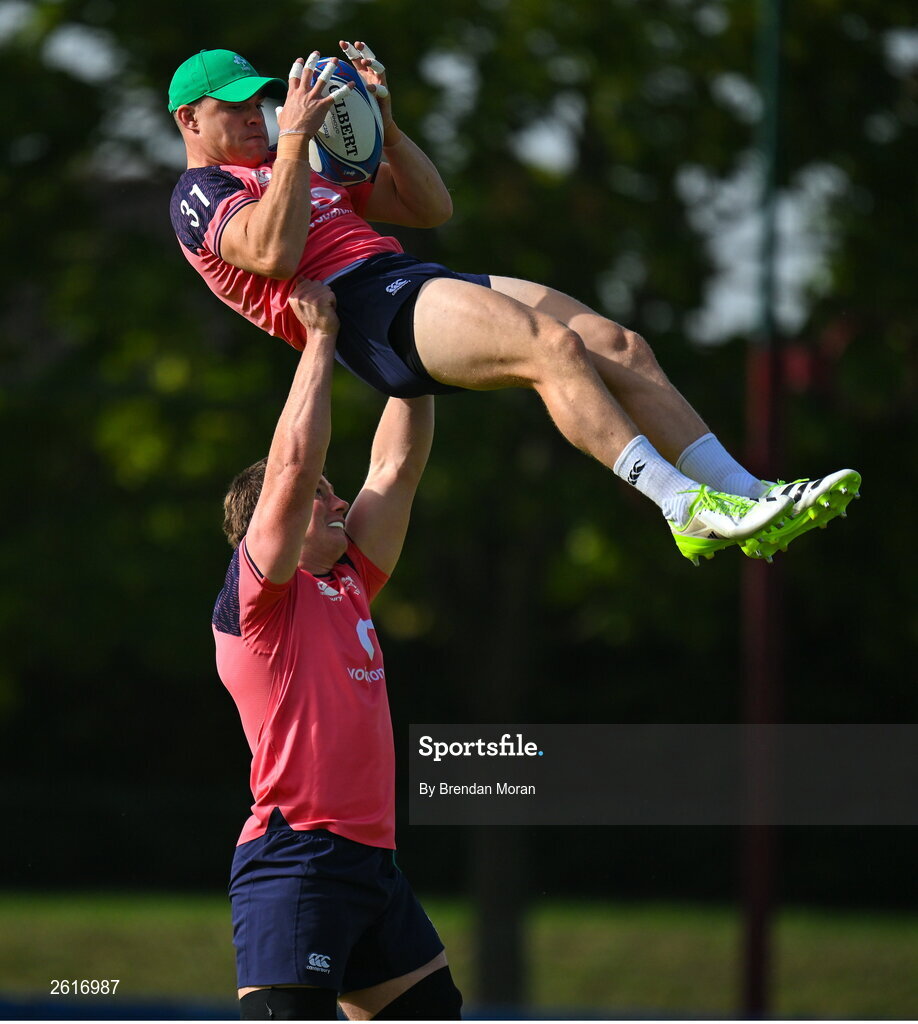 5 September 2023; Garry Ringrose is lifted by Joe McCarthy during an Ireland rugby squad training session at Complexe de la Chambrerie in Tours, France. Photo by Brendan Moran/Sportsfile