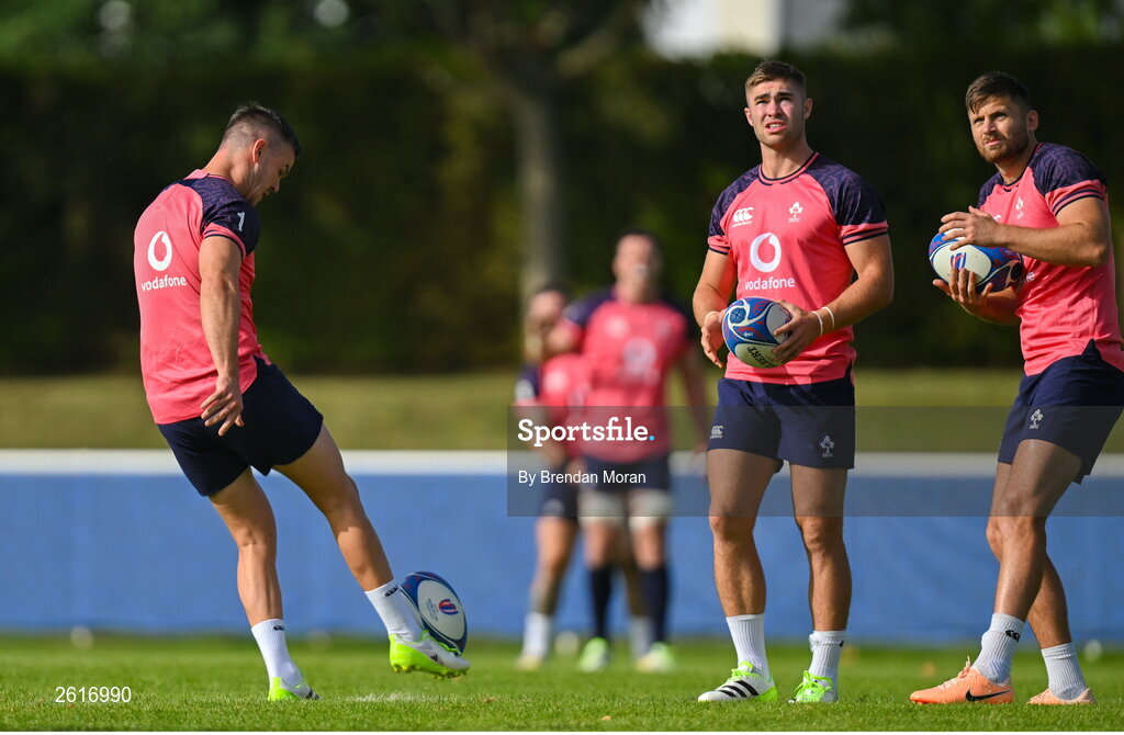 5 September 2023; Jonathan Sexton, left, with Jack Crowley and Ross Byrne during an Ireland rugby squad training session at Complexe de la Chambrerie in Tours, France. Photo by Brendan Moran/Sportsfile