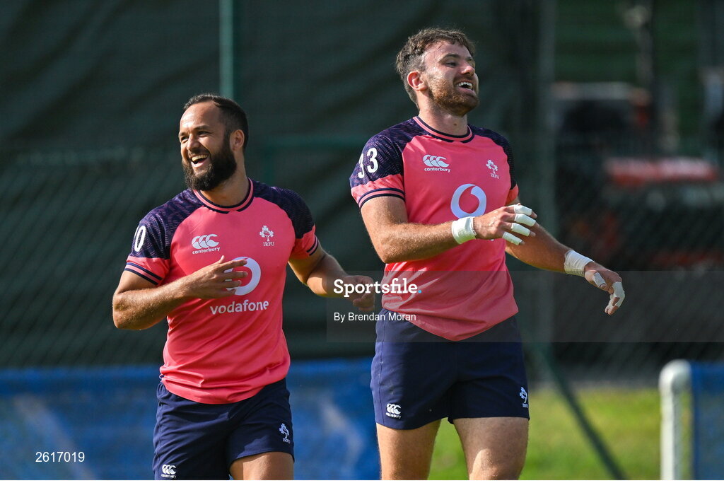 5 September 2023; Hugo Keenan, right, and Jamison Gibson-Park during an Ireland rugby squad training session at Complexe de la Chambrerie in Tours, France. Photo by Brendan Moran/Sportsfile
