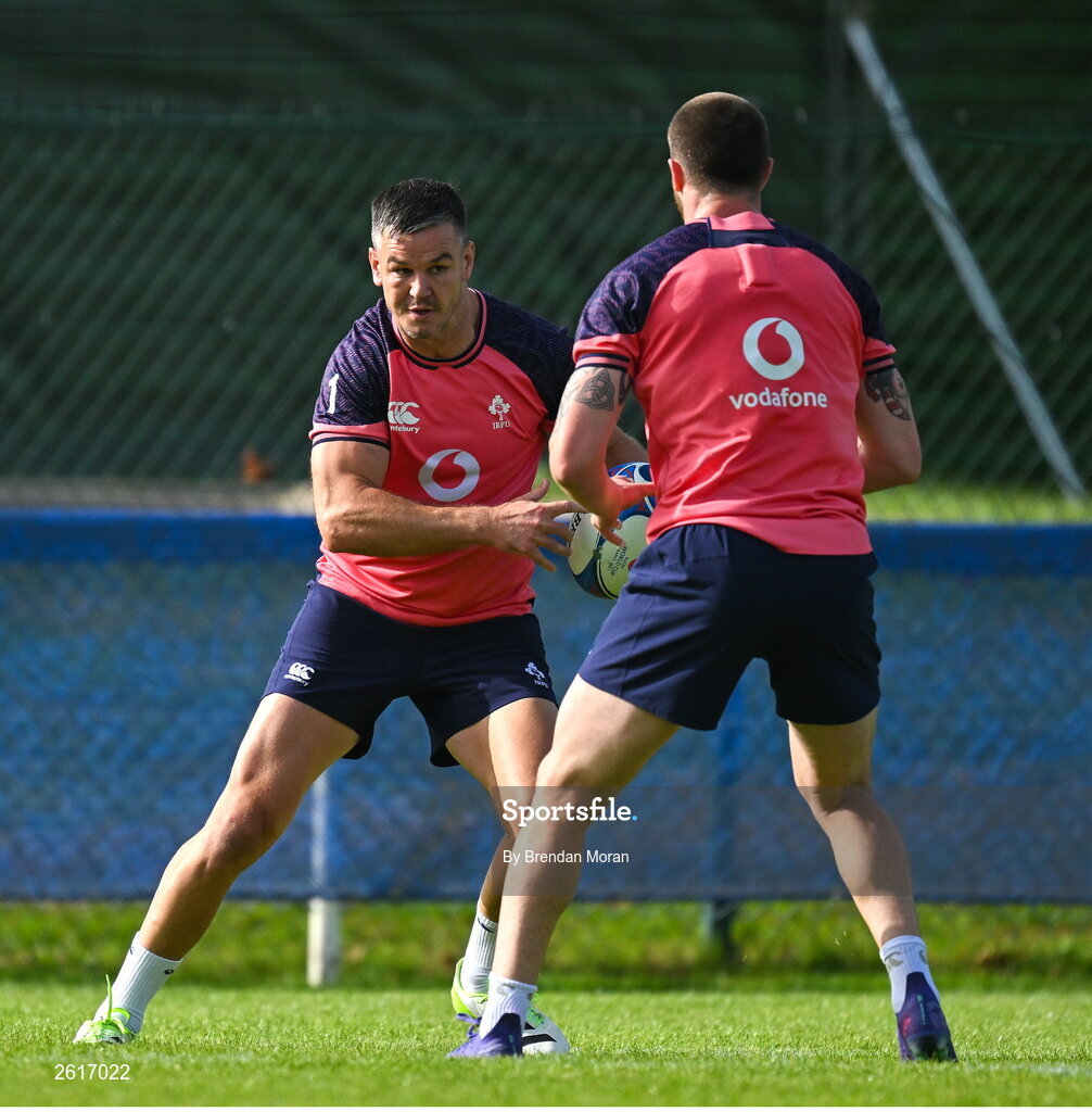 5 September 2023; Jonathan Sexton, left, and Mack Hansen during an Ireland rugby squad training session at Complexe de la Chambrerie in Tours, France. Photo by Brendan Moran/Sportsfile