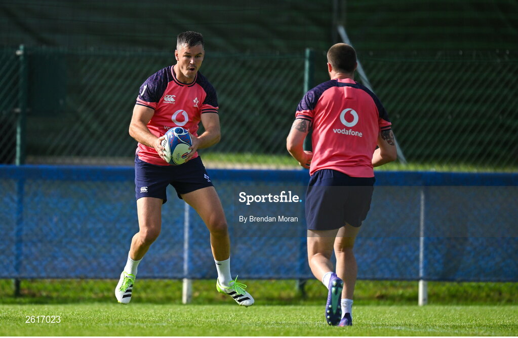 5 September 2023; Jonathan Sexton, left, and Mack Hansen during an Ireland rugby squad training session at Complexe de la Chambrerie in Tours, France. Photo by Brendan Moran/Sportsfile