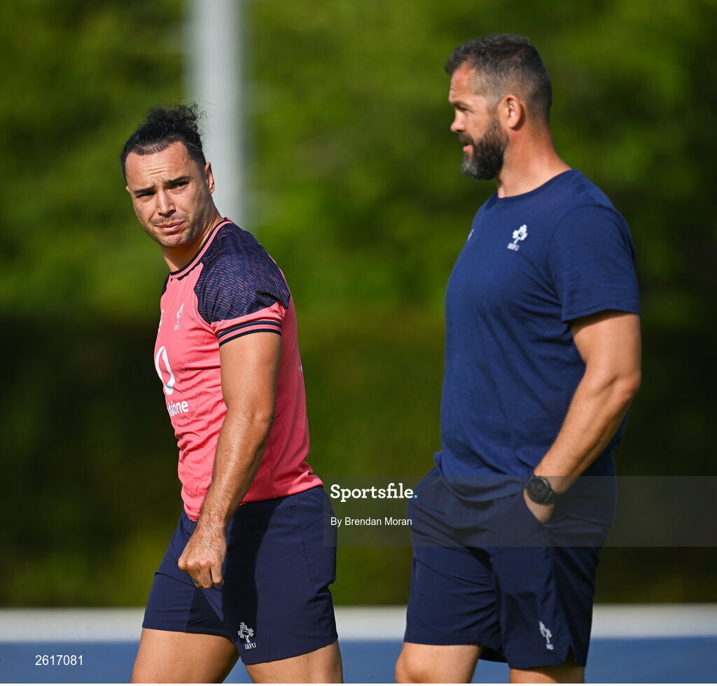 5 September 2023; James Lowe, left, and head coach Andy Farrell during an Ireland rugby squad training session at Complexe de la Chambrerie in Tours, France. Photo by Brendan Moran/Sportsfile