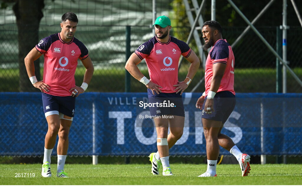 5 September 2023; Ireland players, from left, Conor Murray, Robbie Henshaw and Bundee Aki during squad training session at Complexe de la Chambrerie in Tours, France. Photo by Brendan Moran/Sportsfile