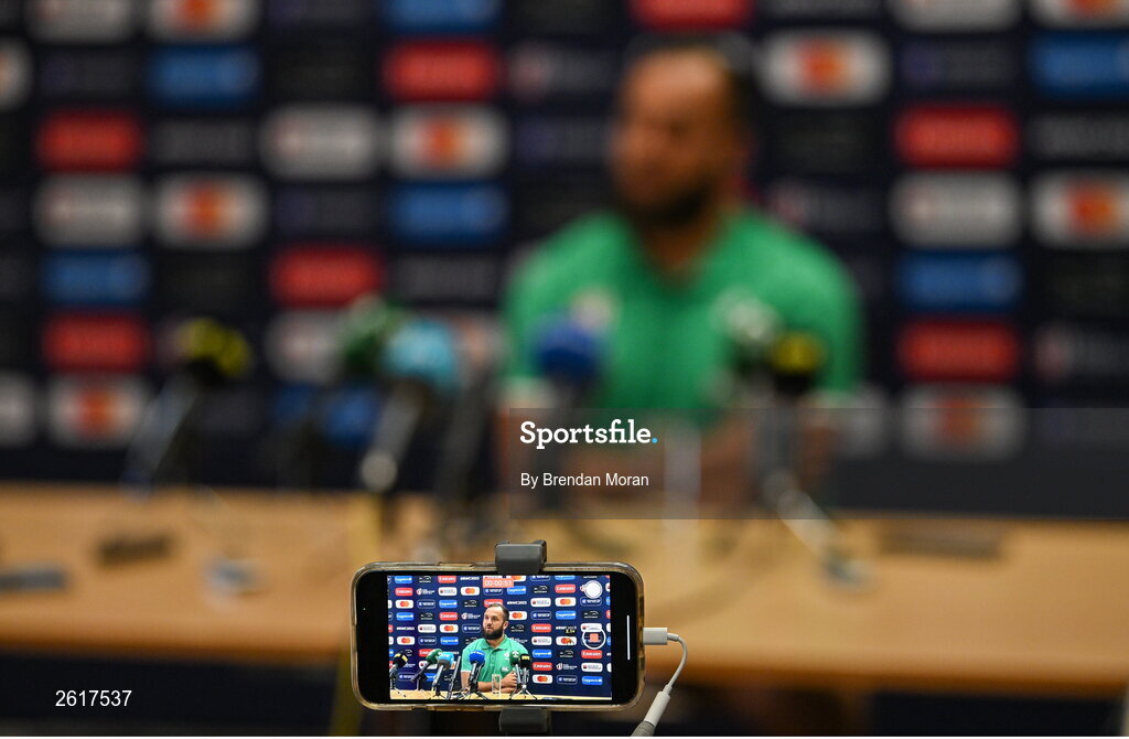 5 September 2023; Jamison Gibson-Park is recorded on a smartphone during an Ireland rugby media conference at Tours Town Hall in Tours, France. Photo by Brendan Moran/Sportsfile