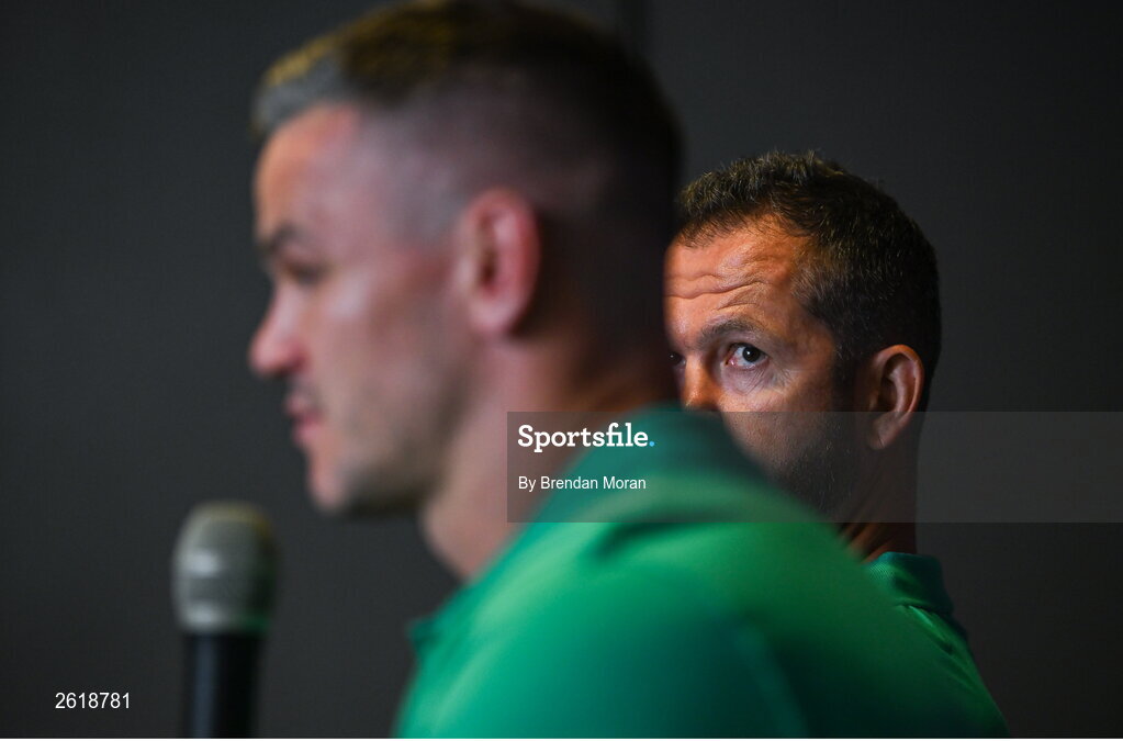 7 September 2023; Head coach Andy Farrell watches captain Jonathan Sexton during an Ireland rugby media conference at the Mercure Hotel in Bordeaux, France. Photo by Brendan Moran/Sportsfile
