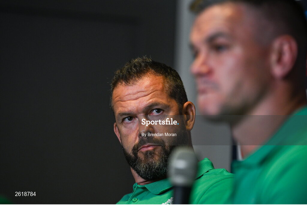 7 September 2023; Head coach Andy Farrell watches captain Jonathan Sexton during an Ireland rugby media conference at the Mercure Hotel in Bordeaux, France. Photo by Brendan Moran/Sportsfile