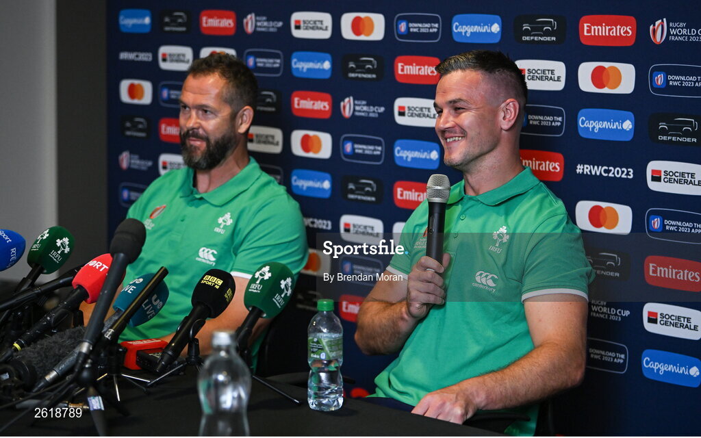 7 September 2023; Captain Jonathan Sexton, right, and cead coach Andy Farrell during an Ireland rugby media conference at the Mercure Hotel in Bordeaux, France. Photo by Brendan Moran/Sportsfile