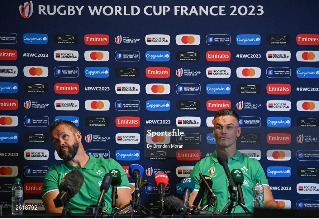 7 September 2023; Captain Jonathan Sexton, right, and cead coach Andy Farrell during an Ireland rugby media conference at the Mercure Hotel in Bordeaux, France. Photo by Brendan Moran/Sportsfile