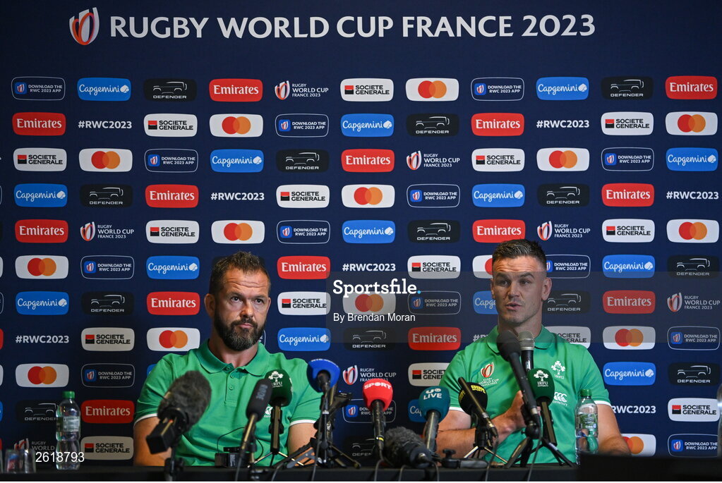 7 September 2023; Captain Jonathan Sexton, right, and cead coach Andy Farrell during an Ireland rugby media conference at the Mercure Hotel in Bordeaux, France. Photo by Brendan Moran/Sportsfile