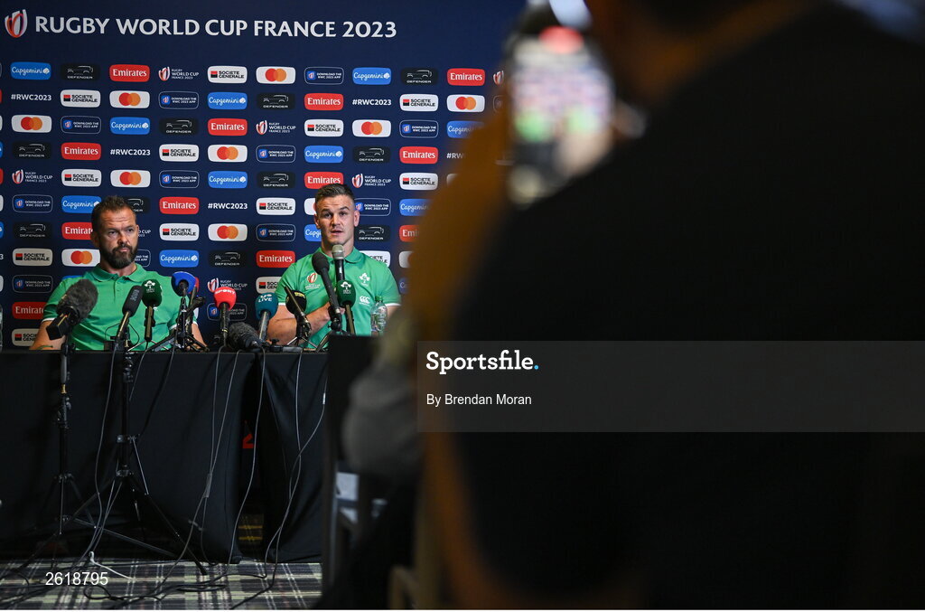 7 September 2023; Captain Jonathan Sexton, right, and cead coach Andy Farrell during an Ireland rugby media conference at the Mercure Hotel in Bordeaux, France. Photo by Brendan Moran/Sportsfile