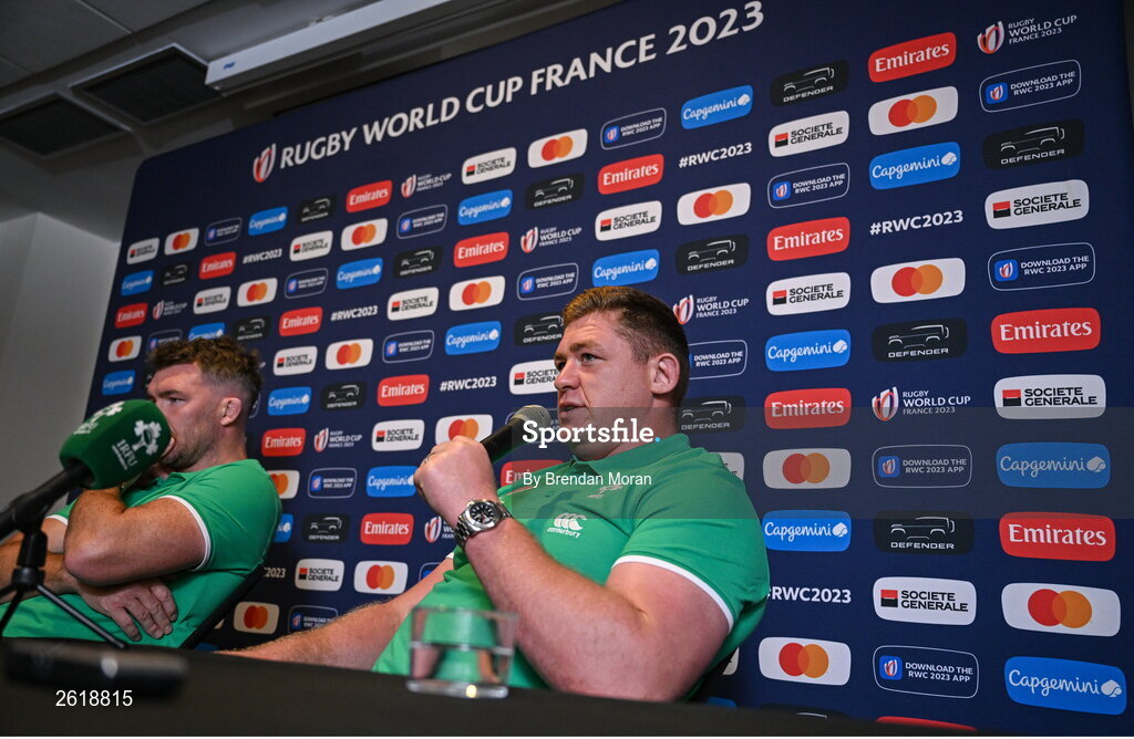 7 September 2023; Tadhg Furlong, and Peter O’Mahony, left, during an Ireland rugby media conference at the Mercure Hotel in Bordeaux, France. Photo by Brendan Moran/Sportsfile
