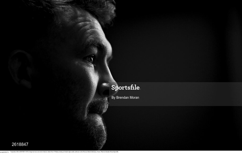 7 September 2023; (EDITOR'S NOTE; Image has been converted to black & white) Peter O’Mahony during an Ireland rugby media conference at the Mercure Hotel in Bordeaux, France. Photo by Brendan Moran/Sportsfile