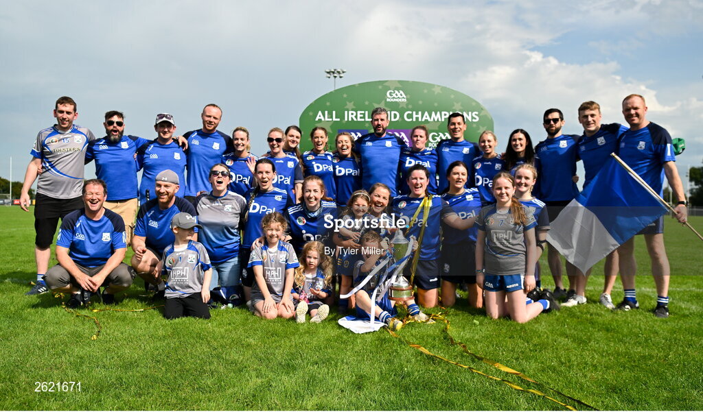 10 September 2023; The Breaffy GAA team celebrate with the trophy and friends & family after their side's victory in the GAA Rounders All Ireland Senior Finals match between Breaffy GAA and Glynn Barntown at Kinnegad GAA in Kinnegad, Westmeath. Photo by Tyler Miller/Sportsfile