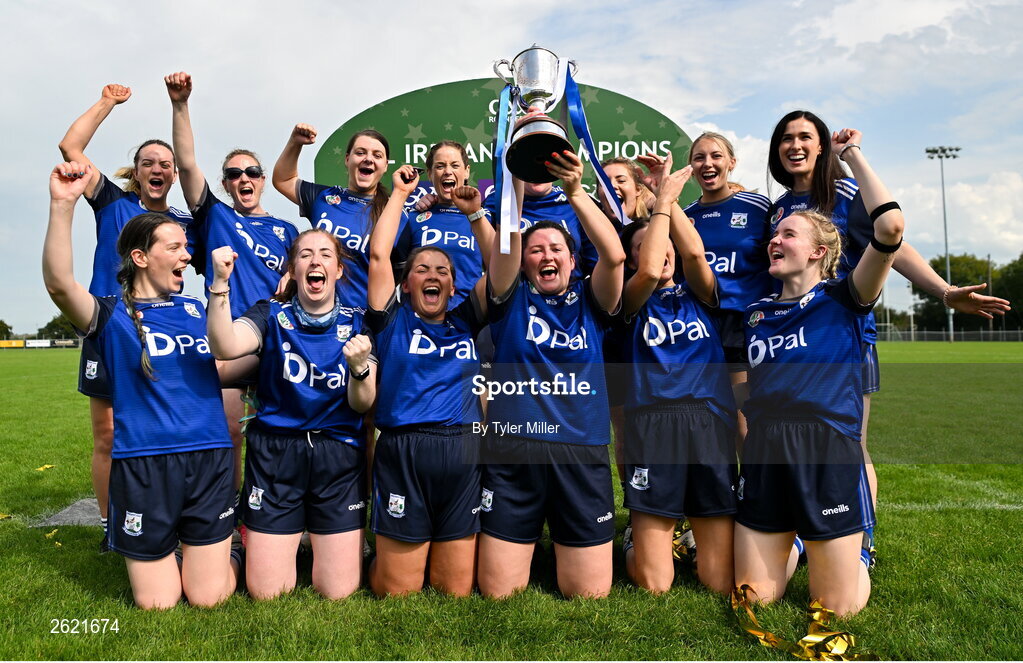 10 September 2023; The Breaffy GAA team celebrate with the trophy after their side's victory in the GAA Rounders All Ireland Senior Finals match between Breaffy GAA and Glynn Barntown at Kinnegad GAA in Kinnegad, Westmeath. Photo by Tyler Miller/Sportsfile