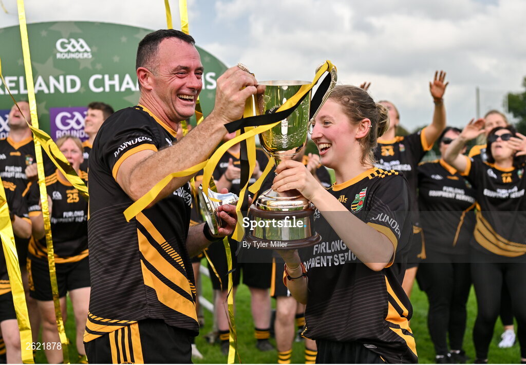 10 September 2023; Joint The Heath capatains Dwayne Keane, left, and Grace Salmon celebrate with the trophy after their side's victory in the GAA Rounders All Ireland Senior Finals match between Limekiln Rounders GAA and The Heath at Kinnegad GAA in Kinnegad, Westmeath. Photo by Tyler Miller/Sportsfile