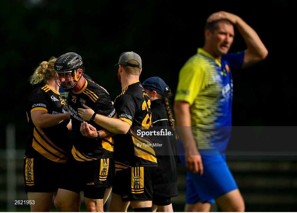 10 September 2023; Dwayne Keane of The Heath celebrates with teammates after his side's victory in the GAA Rounders All Ireland Senior Finals match between Limekiln Rounders GAA and The Heath at Kinnegad GAA in Kinnegad, Westmeath. Photo by Tyler Miller/Sportsfile