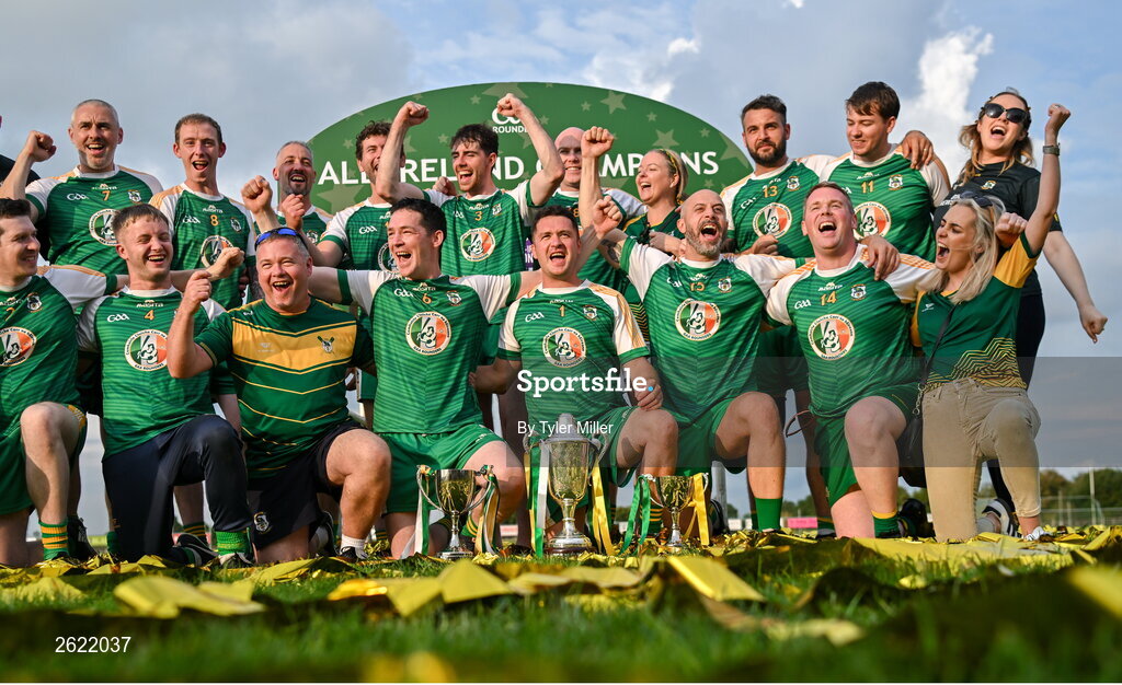 10 September 2023; The Carrickmacross Emmets team celebrate with the trophy after their side's victory in the GAA Rounders All Ireland Senior Finals match between Carrickmacross Emmets and Erne Eagles at Kinnegad GAA in Kinnegad, Westmeath. Photo by Tyler Miller/Sportsfile