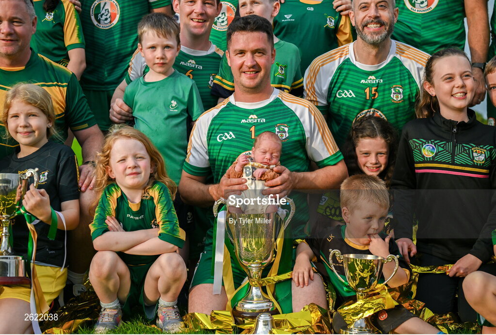10 September 2023; Carrickmacross Emmets captain Colm Kiernan celebrates with his son, Colm Kiernan, aged 6 weeks, and the trophy after his side's victory in the GAA Rounders All Ireland Senior Finals match between Carrickmacross Emmets and Erne Eagles at Kinnegad GAA in Kinnegad, Westmeath. Photo by Tyler Miller/Sportsfile