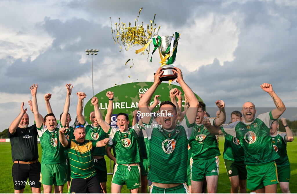 10 September 2023; Carrickmacross Emmets captain Colm Kiernan celebrates with the trophy after his side's victory during the GAA Rounders All Ireland Senior Finals match between Carrickmacross Emmets and Erne Eagles at Kinnegad GAA in Kinnegad, Westmeath. Photo by Tyler Miller/Sportsfile