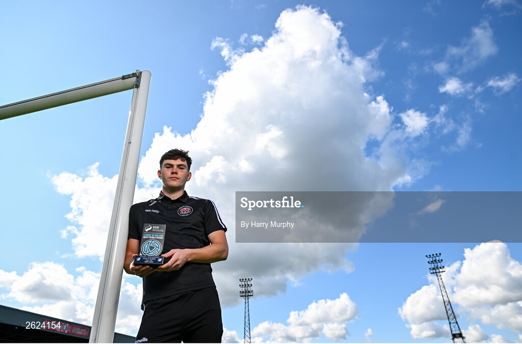14 September 2023; James Clarke of Bohemians with his SSE Airtricity / SWI Player of the Month award for August 2023 at Dalymount Park in Dublin. Photo by Harry Murphy/Sportsfile