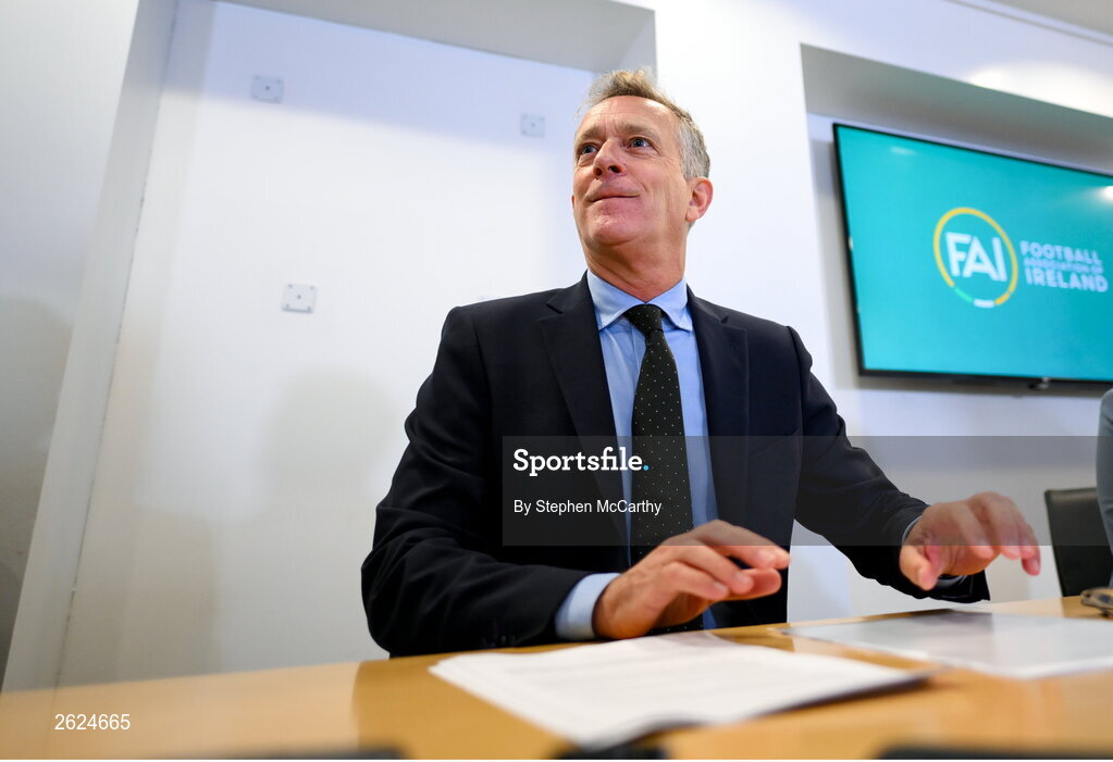 14 September 2023; FAI chief executive Jonathan Hill during an FAI media briefing at FAI Headquarters in Abbotstown, Dublin. Photo by Stephen McCarthy/Sportsfile