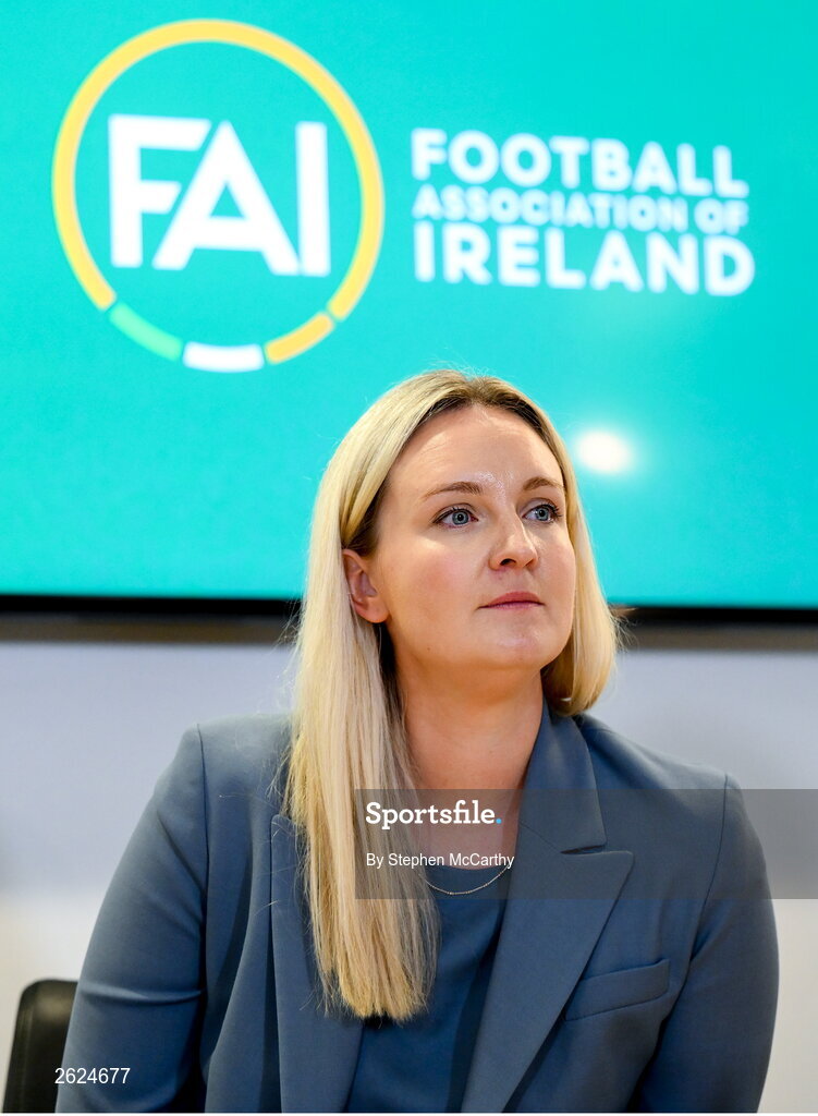 14 September 2023; FAI director of marketing and communications Louise Cassidy during an FAI media briefing at FAI Headquarters in Abbotstown, Dublin. Photo by Stephen McCarthy/Sportsfile