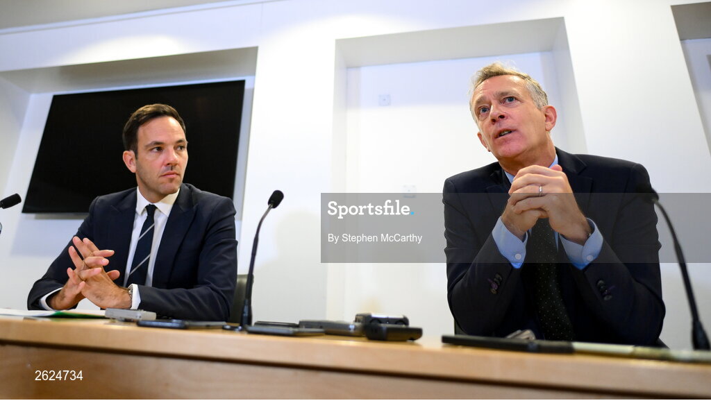 14 September 2023; FAI director of football Marc Canham, left, and FAI chief executive Jonathan Hill during an FAI media briefing at FAI Headquarters in Abbotstown, Dublin. Photo by Stephen McCarthy/Sportsfile