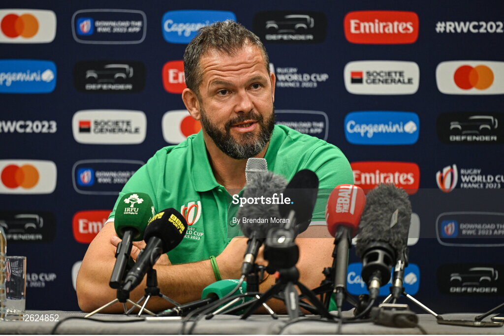 14 September 2023; Head coach Andy Farrell during an Ireland rugby media conference at the Westotel Nantes Atlantique in Nantes, France. Photo by Brendan Moran/Sportsfile