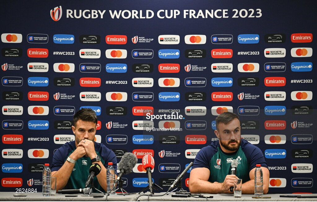 14 September 2023; Rónan Kelleher, right, and Conor Murray during an Ireland rugby media conference at the Westotel Nantes Atlantique in Nantes, France. Photo by Brendan Moran/Sportsfile